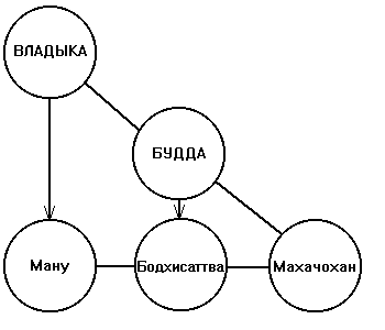 Первый и второй члены этого великого Треугольника отличаются от третьего, будучи заняты работой, не доходящей до физического плана, но спускающейся лишь до уровня буддхического плана у Господа Будды и атмического плана у великого представителя первого аспекта. И всё же, без их высшей работы невозможна была бы работа на низших уровнях, поэтому они заботятся о передаче своего влияния до самых низких планов через своих представителей — Вайвасвата Ману и Господа Майтрею соответственно.