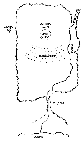 Избранное место — это небольшое плато, окруженное низкими холмами, находящееся на северном склоне Гималаев, недалеко от границы Непала и, быть может, в четырехстах милях к западу от Лхасы. Эта маленькая равнина (см. рис. 11) имеет неправильно продолговатую форму, будучи приблизительно полторы мили в длину и несколько меньше в ширину. Площадка слегка наклонена от юга к северу, по большей части голая и каменистая, лишь местами на ней грубая, жесткая трава и жалкая растительность в виде кустов. В западной части плоскогорья протекает ручей, пересекая его северо-западный угол и вытекая из неё в середине северной стороны, через заросшее соснами ущелье, впадая, очевидно, в озеро, которое видно на расстоянии нескольких миль. Окружающая местность имеет дикий необитаемый вид; не видно никаких строений, за исключением единственной полуразрушенной ступы с двумя-тремя хижинами возле нее, на склоне одного из холмов на восток от равнины. Приблизительно в центре южной её половины лежит огромный серовато-белый камень с какими-то блестящими прожилками, имеющий форму алтаря, футов двенадцать в длину и около шести футов в ширину, и возвышающийся над землей приблизительно на три фута.