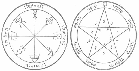 Далее приведен Пентакль для контроля Духа Венеры (слева). Он подходит для всего, что указано в графе "Венера" главы о магии талисманов. Вместо "Дух Баэль" используйте имя соответствующего Архангела. Вызовите Духа Венеры (Архангела) и спросите его о том, что связано с этой планетой. Конечно, вызов нужно проводить в час и, если возможно, в день Венеры.